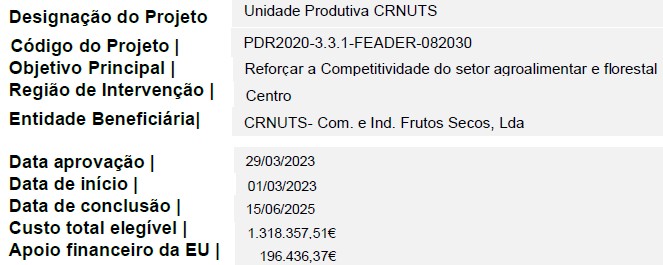 A empresa CRNUTS- Comércio e Indústria de Frutos Secos, Lda, constituída em janeiro de 2020, incide a sua atividade económica no descasque e transformação de frutos de casca rija comestíveis, contemplando a torrefação, a adição de sabores e o embalamento de frutos secos, com especial incidência na castanha de caju.